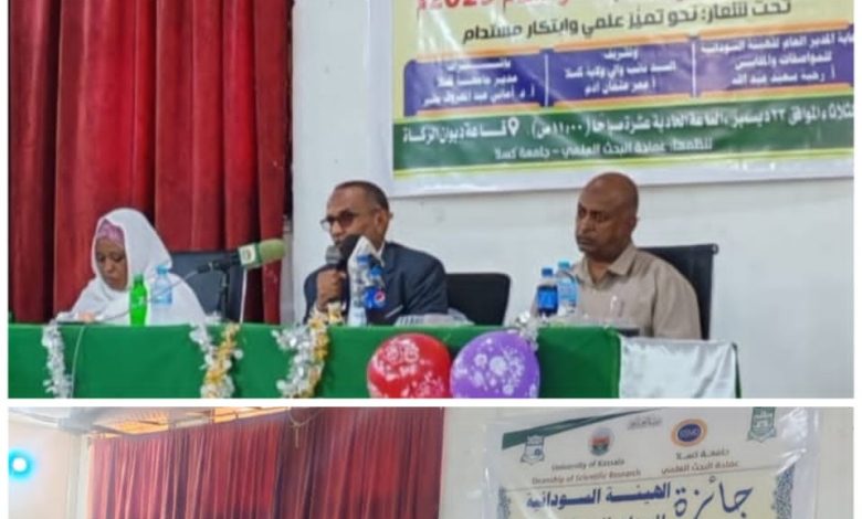 تمّ أمس الأول بجامعة كسلا توزيع جوائز الهيئة السودانية للمواصفات والمقاييس للبحث العلمي والابتكار – الموسم الثاني، وذلك بشراكة مع جامعة كسلا، تحت إشراف الدكتورة آمنة تاج السر عميدة البحث العلمي وبرعاية كريمة من الهيئة السودانية للمواصفات والمقاييس، في خطوة تعكس الاهتمام المتنامي بدعم البحث العلمي وتعزيز ثقافة الجودة والابتكار.
