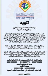 ويأتي هذا التنويه في إطار حرص منظومة الصناعات الدفاعية على ضمان سير المشروع بسلاسة، وتأكيداً على التزامها الإنساني والوطني تجاه السودانيين في دول اللجوء.
