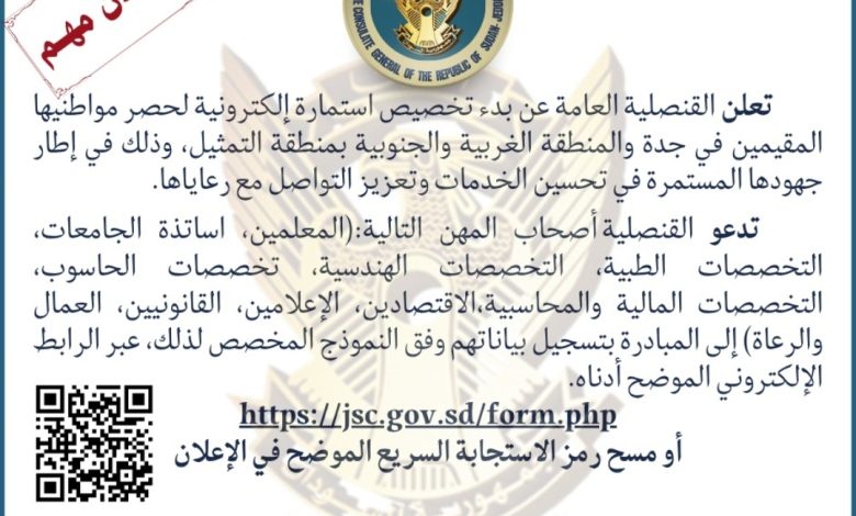 جدة : ارتي ميديا… اعلنت القنصلية العامة لجمهورية السودان بجدة عن بدء تخصيص استمارة إلكترونية لحصر مواطنيها المقيمين في جدة والمنطقة الغربية والجنوبية بمنطقة التمثيل، وذلك في إطار جهودها المستمرة في تحسين الخدمات وتعزيز التواصل مع رعاياها.