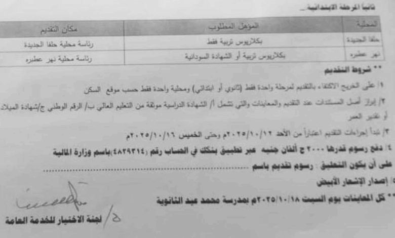 حلفا الجديدة : أرتي ميديا … أثار إعلان صادر عن لجنة الاختيار للخدمة العامة بوزارة المالية بولاية كسلا موجة من الاستغراب بين المتقدمين لوظائف المعلمين بمحليتي حلفا الجديدة ونهار عطبرة ، وذلك بعد اشتراط دفع رسوم تقديم عبر تطبيق “بنكك”، على أن يُكتب في الإشعار الأبيض عبارة “رسوم تقديم”.