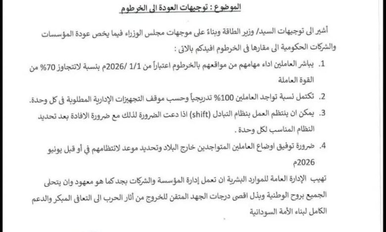 حددت وزارة الطاقة والتعدين ، الأول من يناير من العام المقبل ، موعدا لمزاولة أعمال ونشاط الوزارة من مقارهم النختلفة في الخرطوم اعتباراً من بداية العام 2026، على ألا تتجاوز نسبة العائدين 70% من القوة العاملة في هذه المرحلة.