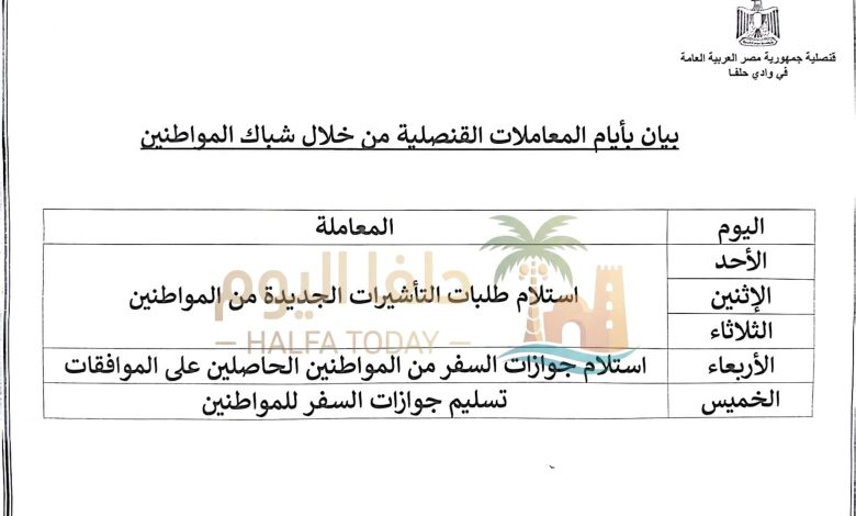 وضعت القنصلية العامة لجمهورية مصر العربية بوادي حلفا ،خطوات جديدة بطلبات الحصول علي التأشيرات منعا لحدوث اي تكدس لهم امام شباك الجمهور، وقررت القنصلية ، تخصيص أيام الأحد والإثنين والثلاثاء من كل اسبوع لإستلام الطلبات الجديده للتأشيرات بعد الإطلاع علي اصول المستندات وإستلام صورها ومليء استمارة الطلب.