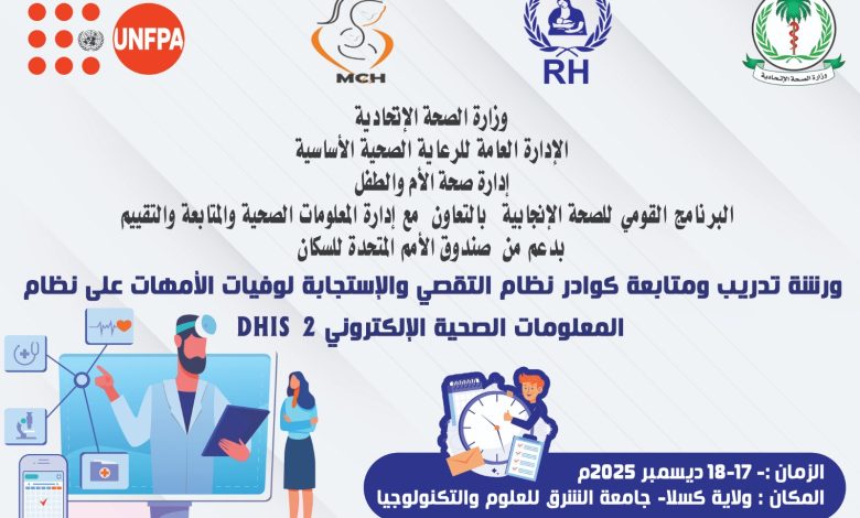 اختتم البرنامج القومي للصحة الانجابية، وإدارة المعلومات الصحية والمتابعة والتقييم بوزارة الصحة الاتحادية، بقاعة جامعة الشرق للعلوم والتكنولوجيا بمدينة كسلا، الورشة التدريبية على نظام المعلومات الصحية الكترونيا.