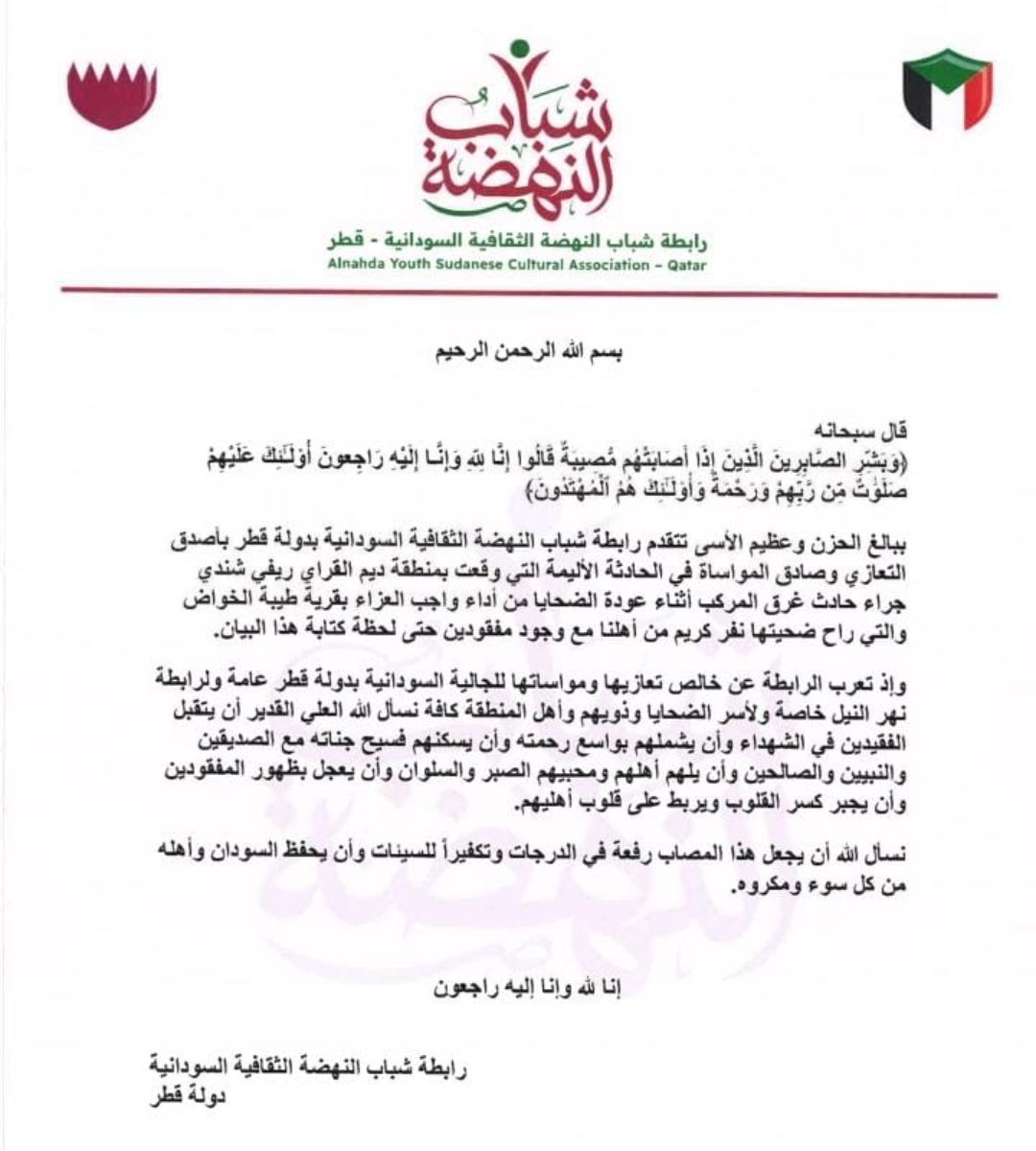 ببالغ الحزن وعظيم الأسى، تتقدم رابطة شباب النهضة الثقافية السودانية بدولة قطر بأصدق التعازي وأحر المواساة في الحادثة الأليمة التي وقعت بمنطقة ديم القراي – ريفي شندي – إثر غرق المركب أثناء عودة الضحايا من أداء واجب العزاء بقرية طيبة الخواض، والتي راح ضحيتها نفر كريم من أهلنا، مع وجود مفقودين حتى لحظة كتابة هذا البيان.