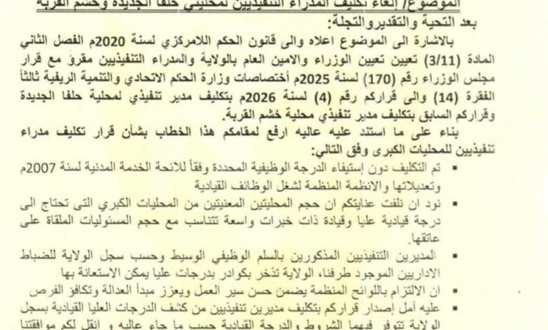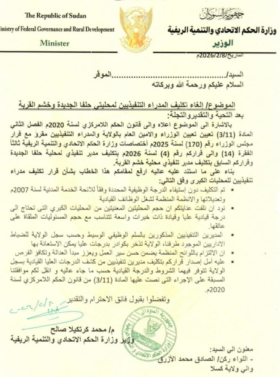 وجاء القرار استناداً إلى قانون الحكم اللامركزي لسنة 2020م، الفصل الثاني المادة (3/11)، الخاصة بتعيين الوزراء والأمين العام بالولاية والمديرين التنفيذيين، والمقروءة مع قرار مجلس الوزراء رقم (170) لسنة 2025م الذي يحدد اختصاصات وزارة الحكم الاتحادي والتنمية الريفية، إلى جانب قرار الوالي رقم (4) لسنة 2026م الخاص بتكليف المدير التنفيذي لمحلية حلفا الجديدة، وقراره السابق المتعلق بمحلية خشم القربة.