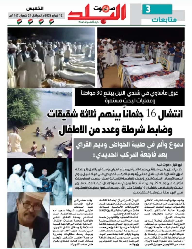 خيّم الحزن على منطقتي طيبة الخواض وديم القراي بولاية نهر النيل، إثر حادثة غرق مأساوية لقارب نقل محلي يُعرف بـ”المركب الحديدي” في مياه النيل، يوم امس الأربعاء.