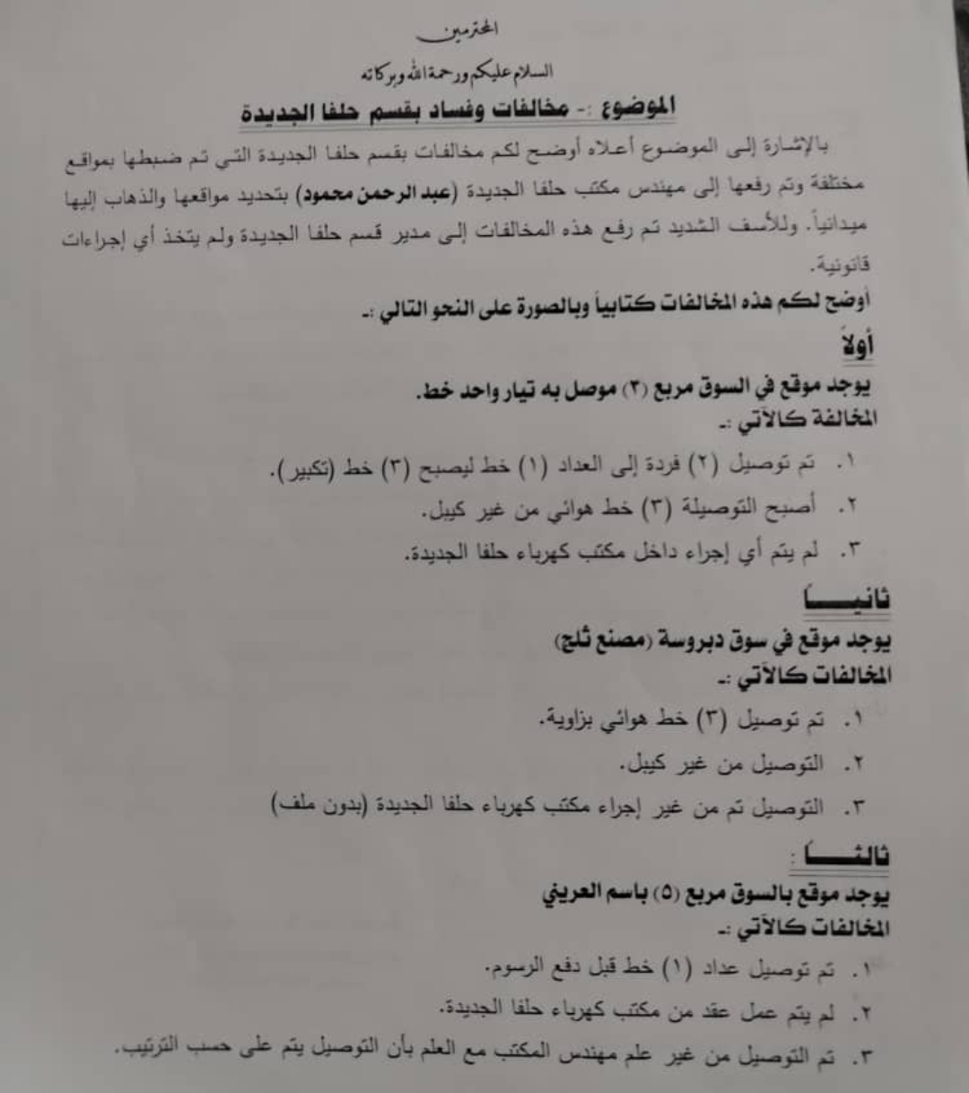 يقول المهندس ميسرة إنه بعد نقله إلى قسم الفاو بولاية القضارف، تقدم بطلبات لإعادته إلى قسم حلفا الجديدة لأسباب أسرية، لكن طلباته قوبلت بالرفض بحجة عدم وجود بديل. لاحقاً، رفع تظلماً رسمياً إلى المدير العام للشركة، مرفقاً بمستندات تكشف مخالفات في عمليات توصيل الكهرباء بسوق حلفا الجديدة وعدد من أحياء المدينة. المستندات، بحسب إفاداته، تضمنت حالات توصيل مباشر دون عدادات أو ملفات رسمية، وهو ما يمثل خرقاً واضحاً للوائح المنظمة للعمل.