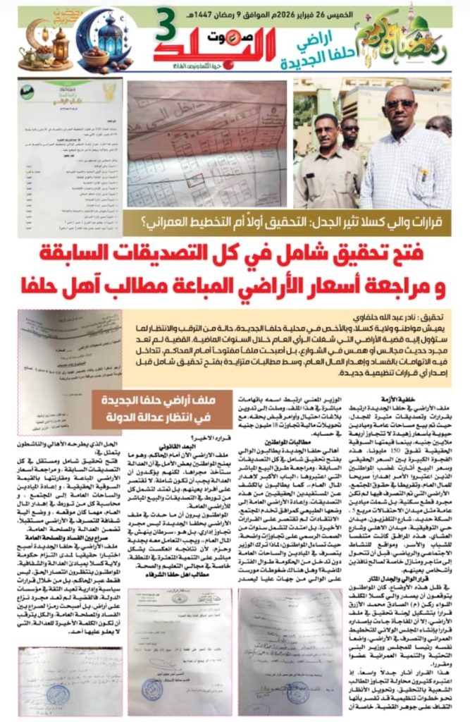 تحقيق : نادر عبد الله حلفاوييعيش مواطنو ولاية كسلا، وبالأخص في محلية حلفا الجديدة، حالة من الترقب والانتظار لما ستؤول إليه قضية الأراضي التي شغلت الرأي العام خلال السنوات الماضية. القضية لم تعد مجرد حديث مجالس أو همس في الشوارع، بل أصبحت ملفاً مفتوحاً أمام المحاكم، تتداخل فيه الاتهامات بالفساد وإهدار المال العام، وسط مطالبات متزايدة بفتح تحقيق شامل قبل إصدار أي قرارات تنظيمية جديدة.