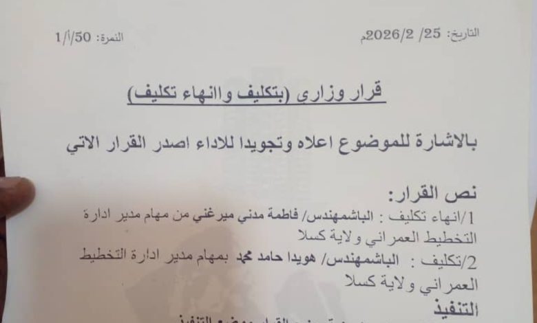 قرار وزاري بإنهاء وتكليف مدير إدارة التخطيط العمراني بولاية كسلا