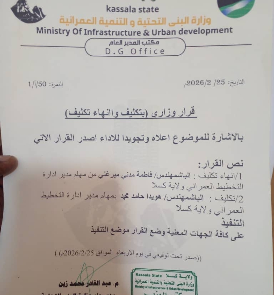 كسلا – أرتي ميديا… أصدر مدير عام وزارة البنى التحتية والتنمية العمرانية بولاية كسلا – الوزير المكلف، المهندس عبد القادر محمد زين، قراراً وزارياً بإنهاء تكليف الباشمهندس/ فاطمة مدني ميرغني من مهام مدير إدارة التخطيط العمراني بالولاية ، و تكليف الباشمهندس/ هويدا حامد محمد بمهام مدير إدارة التخطيط العمراني