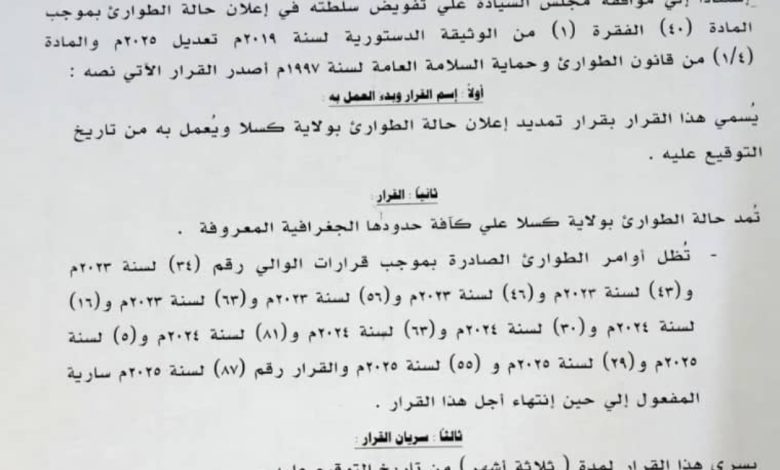 تمديد حالة الطوارئ لتشمل كافة حدود ولاية كسلا الجغرافية ، واستمرار العمل بجميع أوامر الطوارئ السابقة الصادرة بموجب قرارات الوالي خلال الأعوام ٢٠٢٣م – ٢٠٢٥م، إلى حين انتهاء أجل هذا القرار.