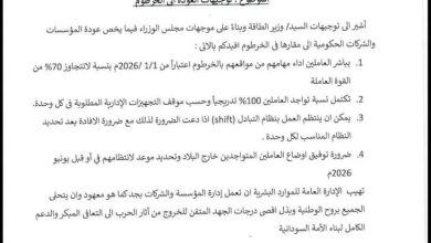 حددت وزارة الطاقة والتعدين ، الأول من يناير من العام المقبل ، موعدا لمزاولة أعمال ونشاط الوزارة من مقارهم النختلفة…